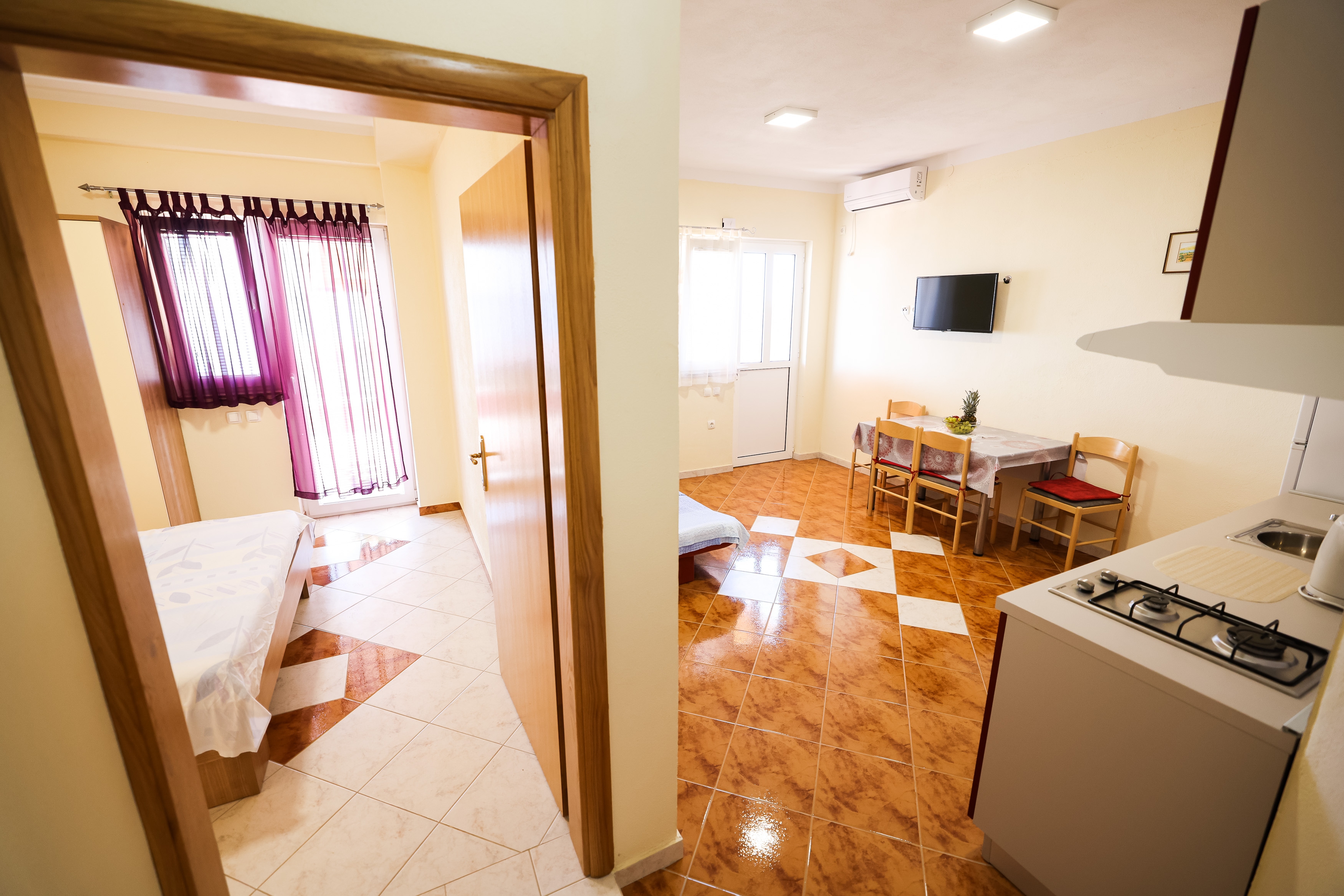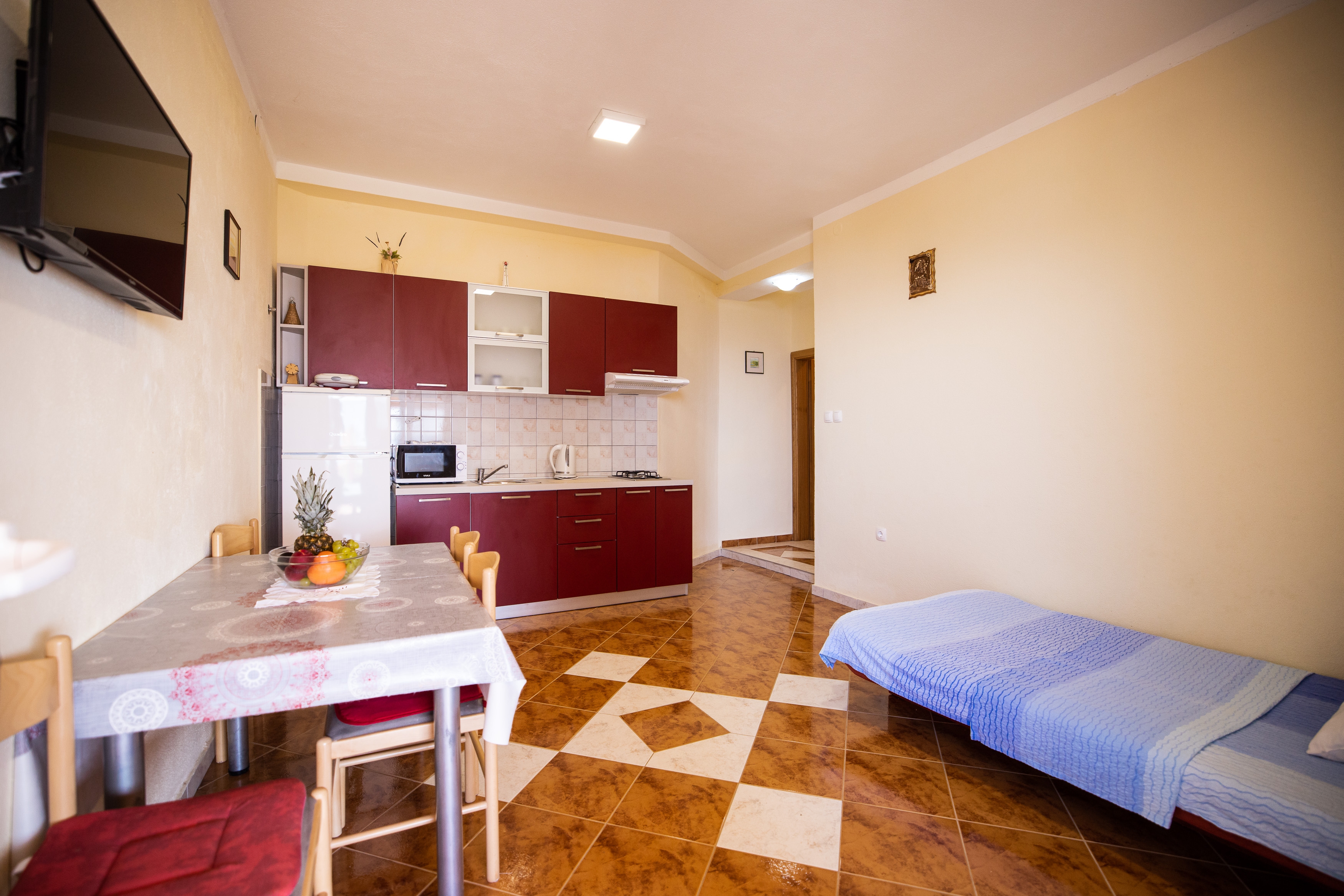 Apartment can accommodate 3 guests. Beds are situated in 1 sleeping rooms, but also in the living room, within 33m2. Guests can use a private terrace to enjoy the warm summer evenings. For full enjoyment and relaxation there is a private barbecue for this accommodation guests only. This accommodation unit welcomes pets at an additional charge. INCLUDED IN THE PRICE: tourist tax, final cleaning, air-conditioning, parking, internet, hairdryer. OPTIONAL ADDITIONAL COSTS: laundry (€10.00 washing), pets (€8.00 per night). The availability of additional services for your chosen dates of stay, as well as their prices (if none are listed) must be checked ahead of time. Any additional services not shown in the price calculation are payable directly to the property owner and only if used by the visitor.